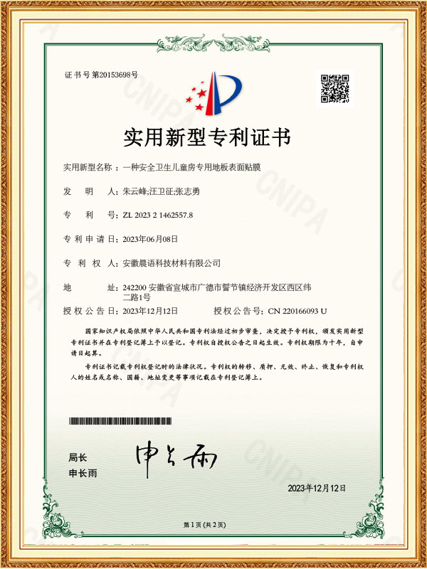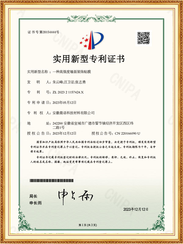 Kekuatan bahasa pagi Anhui terletak bukan hanya dalam keupayaan teknikalnya tetapi juga dalam dedikasinya untuk inovasi. Syarikat itu telah memperoleh pelbagai paten model utiliti, terutamanya dalam bidang filem hiasan dinding dan filem permukaan lantai khas untuk bilik kanak -kanak. Ini bercakap kepada pendekatan pemikiran ke hadapan yang menekankan kedua-dua kreativiti dan ketekunan teknikal. Dengan terus memperbaiki proses pengeluarannya dan melabur dalam penyelidikan, bahasa pagi Anhui berada di hadapan trend pasaran dan bertindak balas dengan berkesan untuk mengundurkan keutamaan pelanggan.